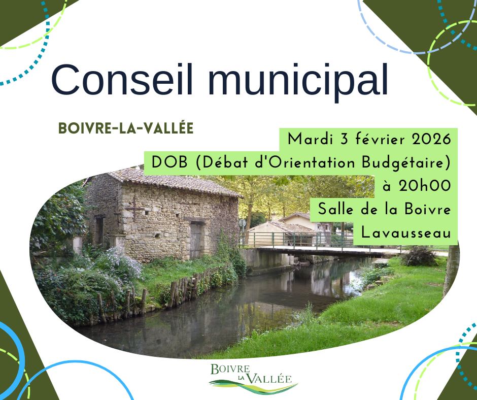 - DOB (Débat d’Orientation Budgétaire) le mardi 3 février 2026* à 20h salle de la Boivre, Lavausseau, 86470 BOIVRE-LA-VALLÉE.*dates indicatives sous réserve de modifications. . Le compte-rendu du Conseil Municipal du lundi 20 janvier 2026 sera publié après validation lors du Conseil Municipal du 3 février 2026. Merci de votre compréhension.