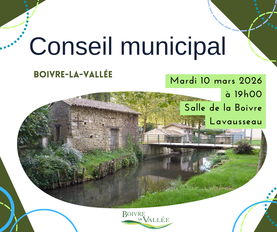 Vous trouverez ci-dessous la programmation des Conseils Municipaux pour l’année 2026, salle de la Boivre, 2 Grand Rue -Lavausseau, 86470 BOIVRE-LA-VALLÉE.