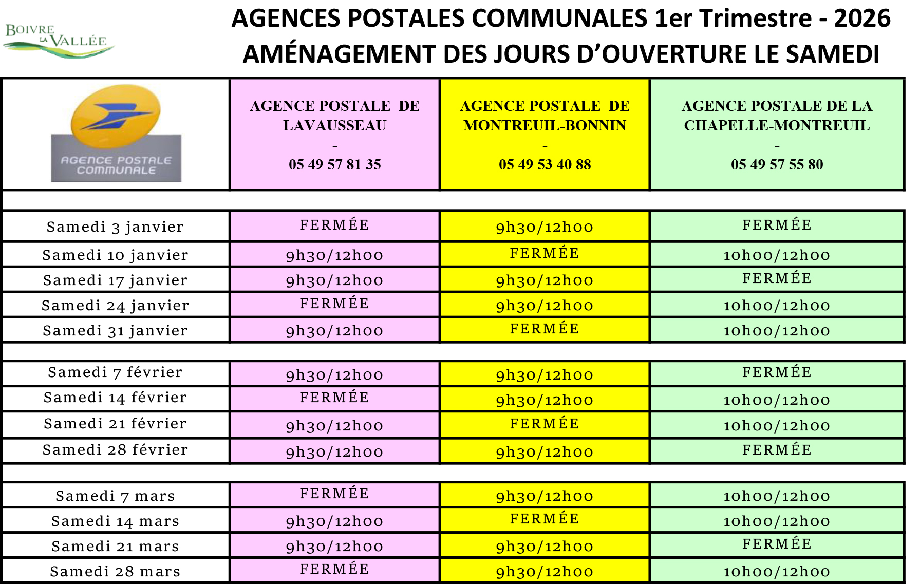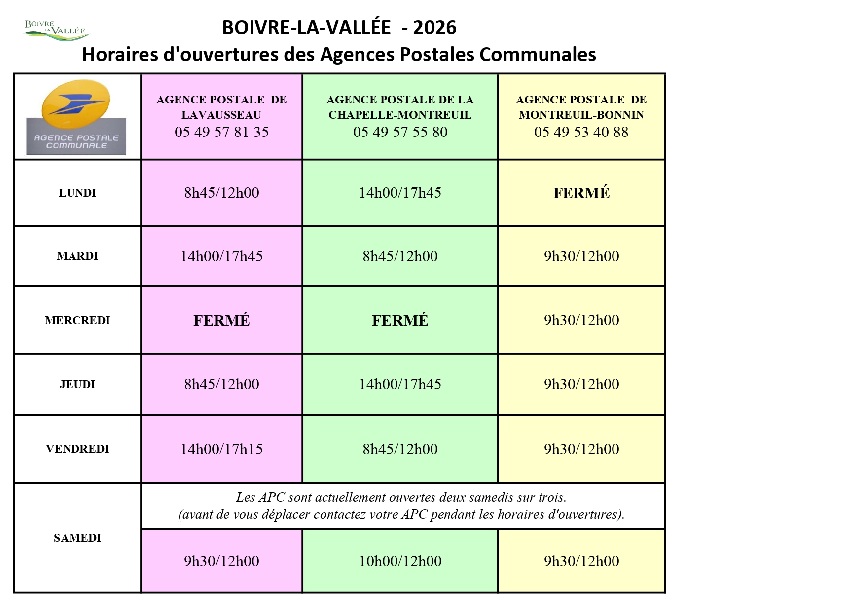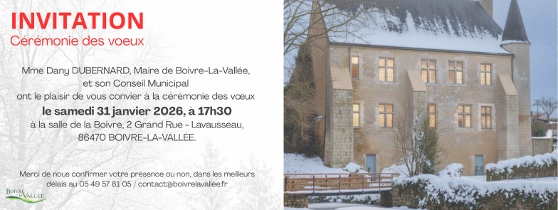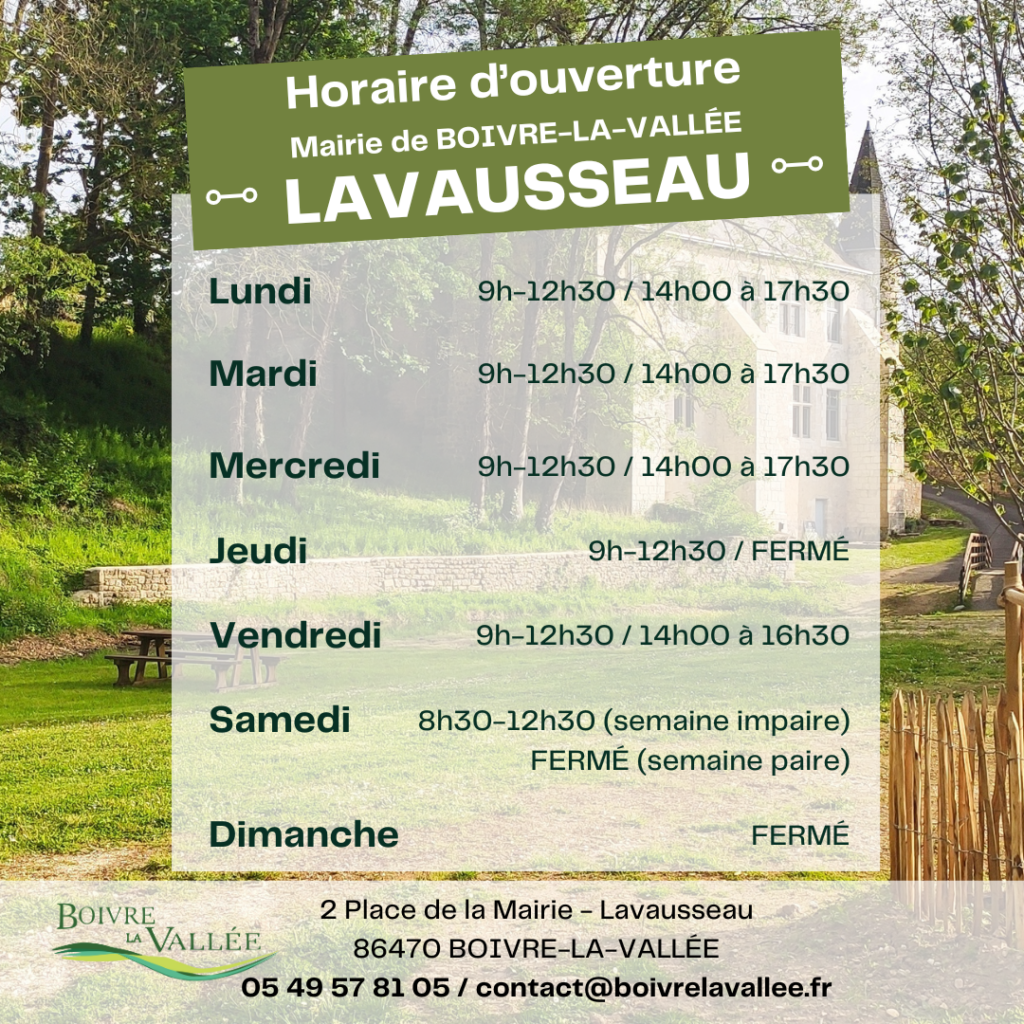 Le secrétariat de la mairie de BOIVRE-LA-VALLÉE est joignable par téléphone, aux horaires d’ouverture de la mairie de Lavausseau :